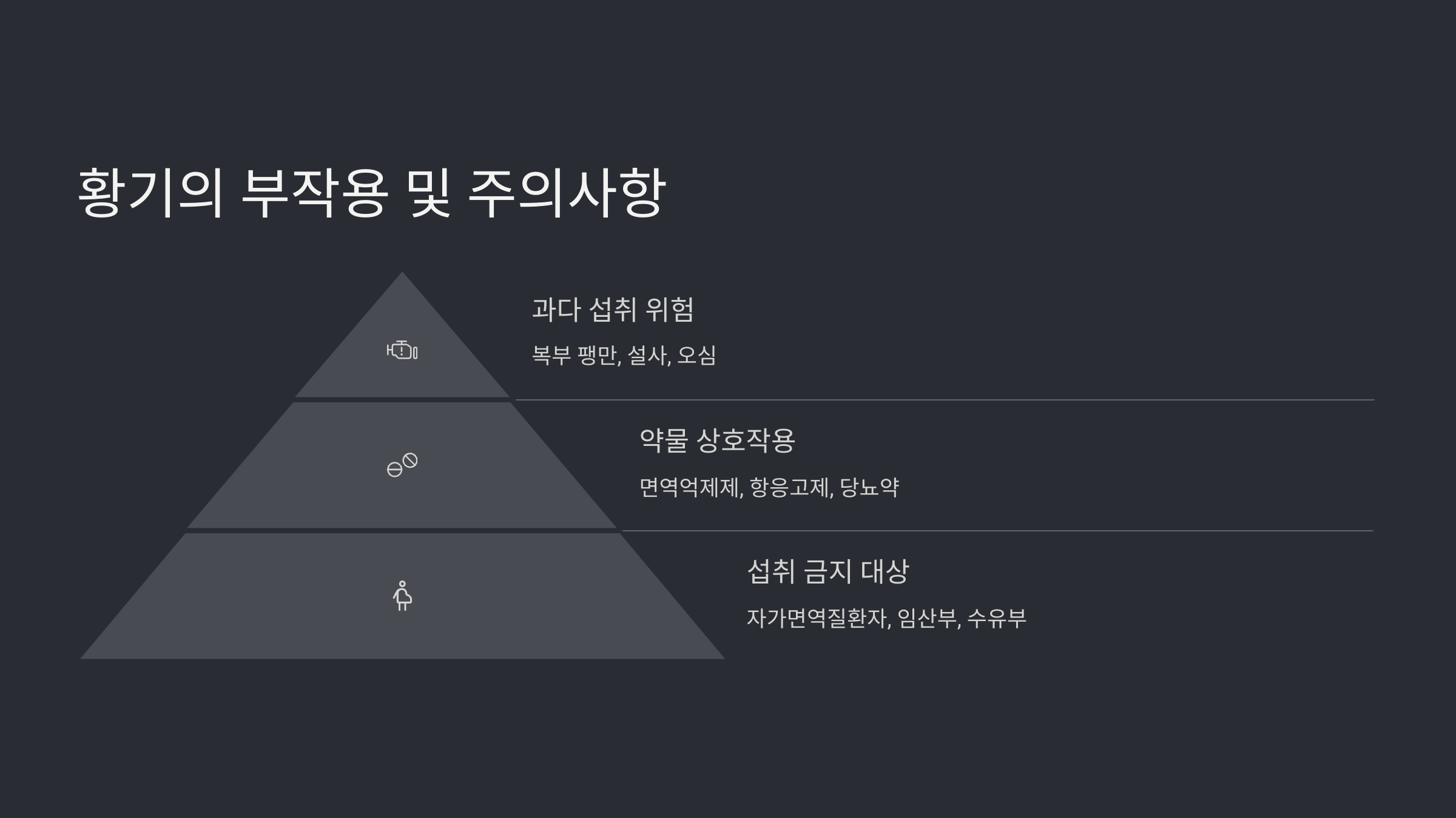 | 단점/주의사항 | ⚠ 과다 섭취 시 설사, 복부 팽만, 두통 ⚠ 자가면역질환자 악화 가능성 ⚠ 약물과의 상호작용 위험 ⚠ 알레르기 반응(가려움, 발진) ⚠ 임산부·수유부 섭취 금지 ⚠ 열 많은 체질 및 상기증 주의 |