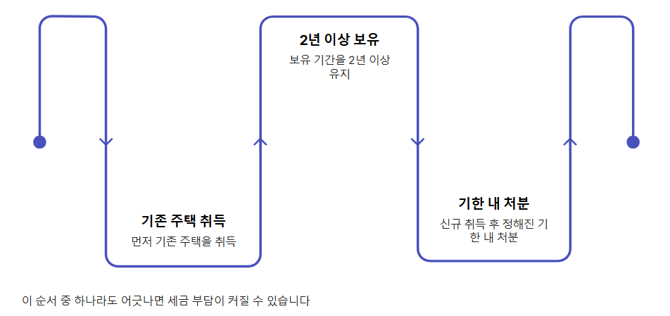 중요한 조건은 크게 세 가지입니다. 첫째, 기존 주택을 먼저 취득하고 일정 기간이 지난 뒤 신규 주택을 취득해야 합니다. 둘째, 기존 주택은 기본적으로 2년 이상 보유해야 합니다. 셋째, 신규 주택 취득 후 정해진 기간 안에 기존 주택을 처분해야 합니다.