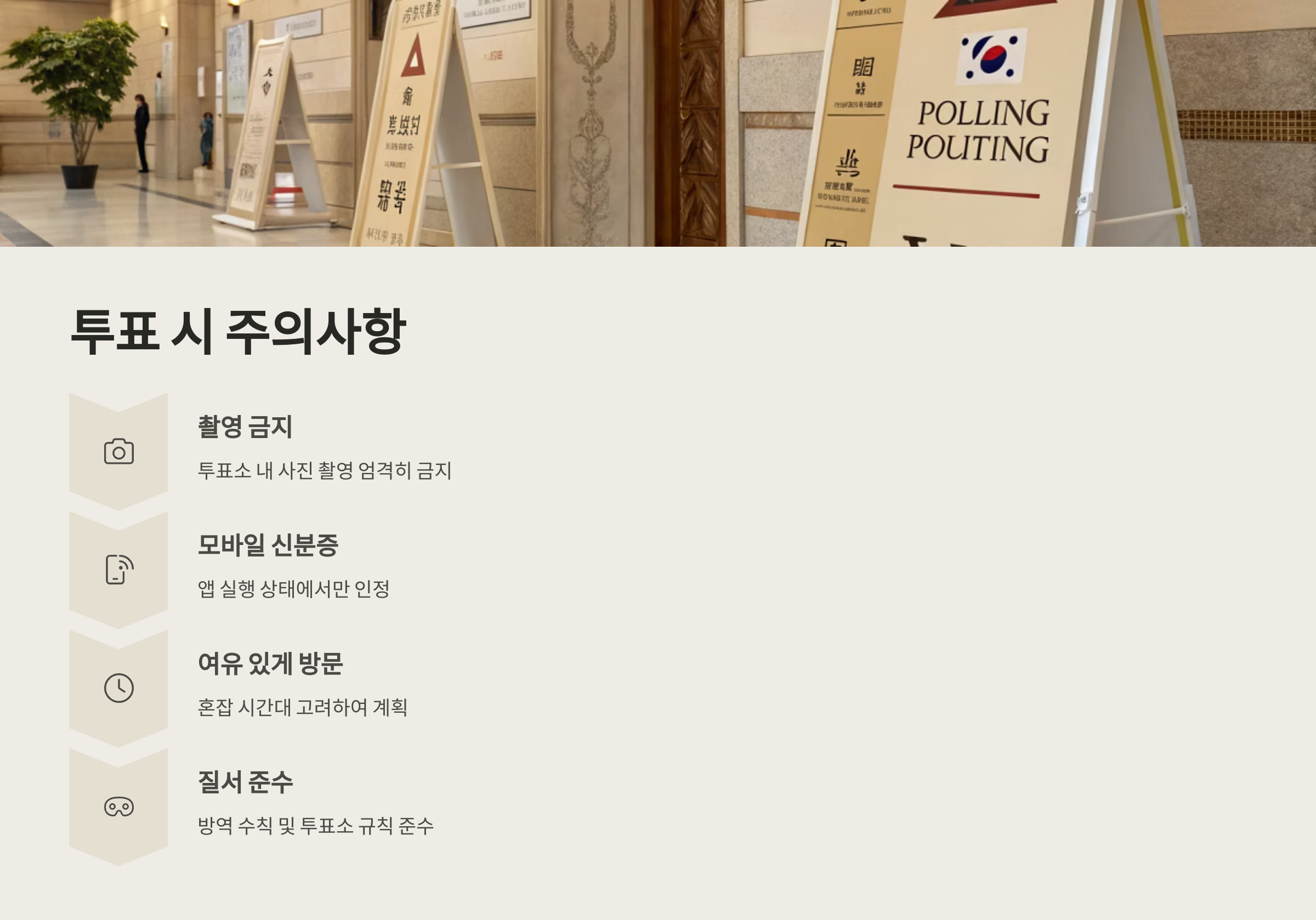 ⚠️ 사진 촬영 금지: 투표소 내에서의 사진 촬영은 엄격히 금지되어 있습니다.