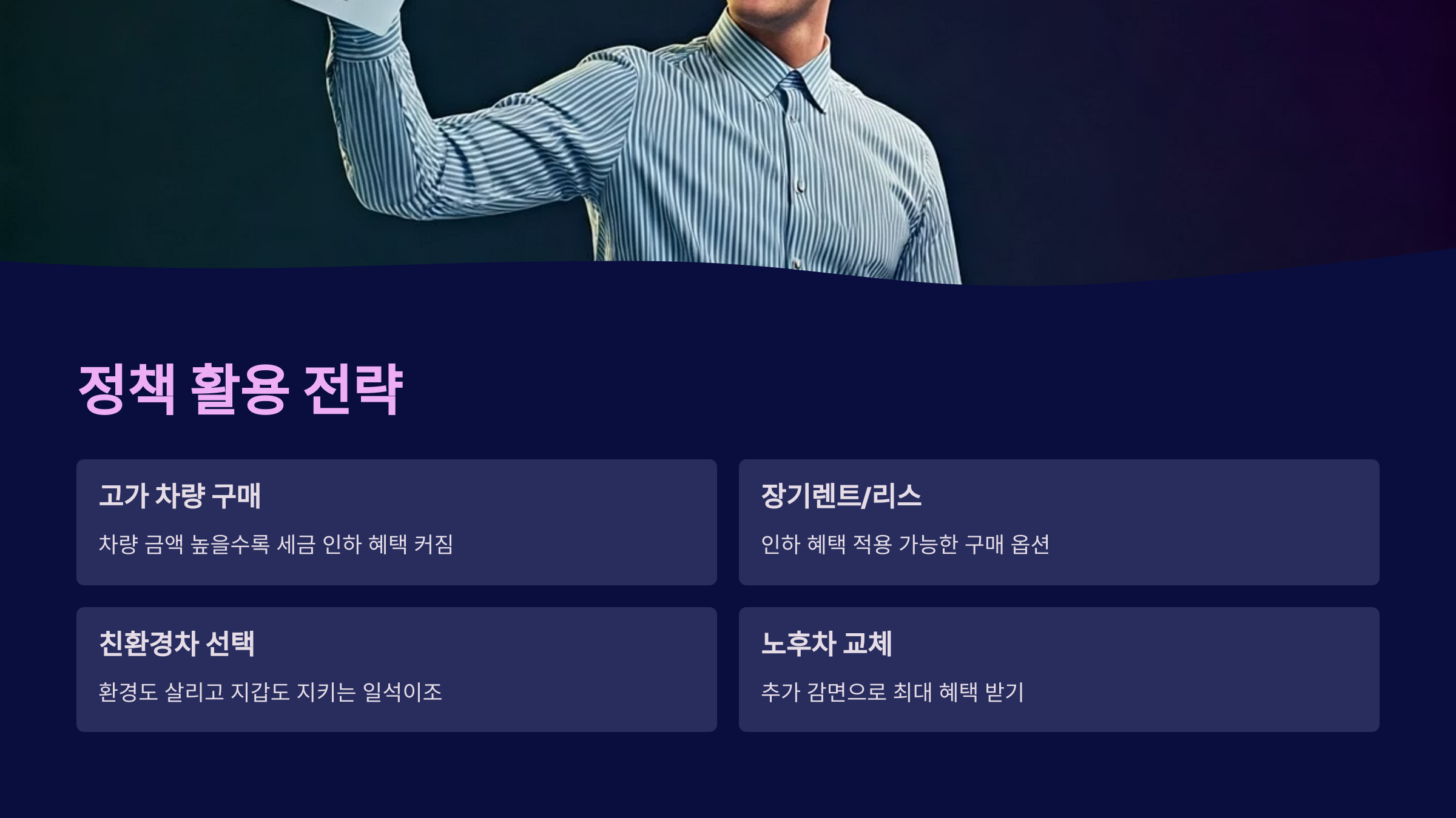 세금 감면 효과는 물론, 친환경차나 노후차 교체 시 추가 인센티브까지 받을 수 있으니 계획적으로 활용해 보세요!