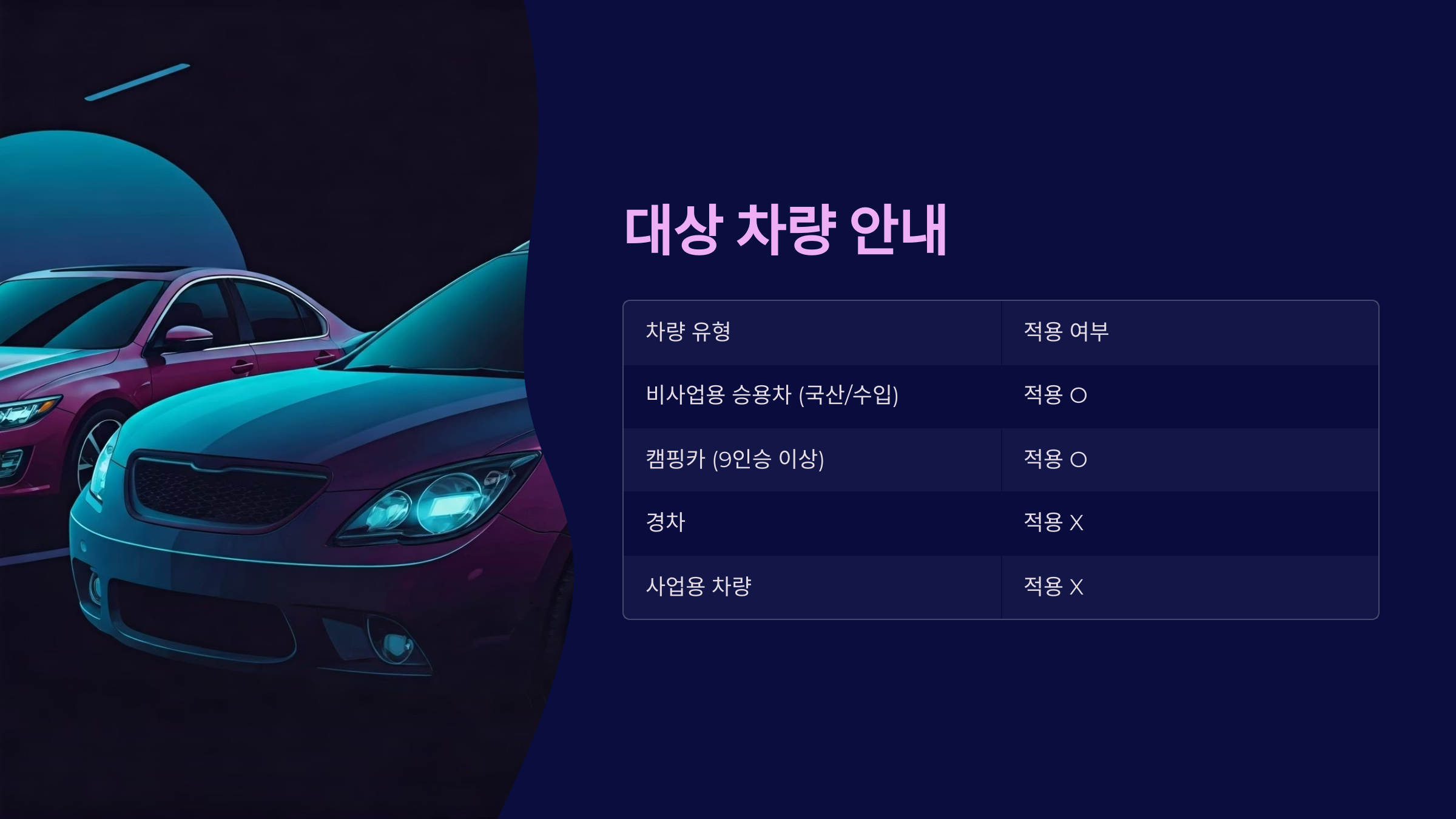 🔖 감면 대상: 비사업용 승용차, 캠핑카 (경차 제외)