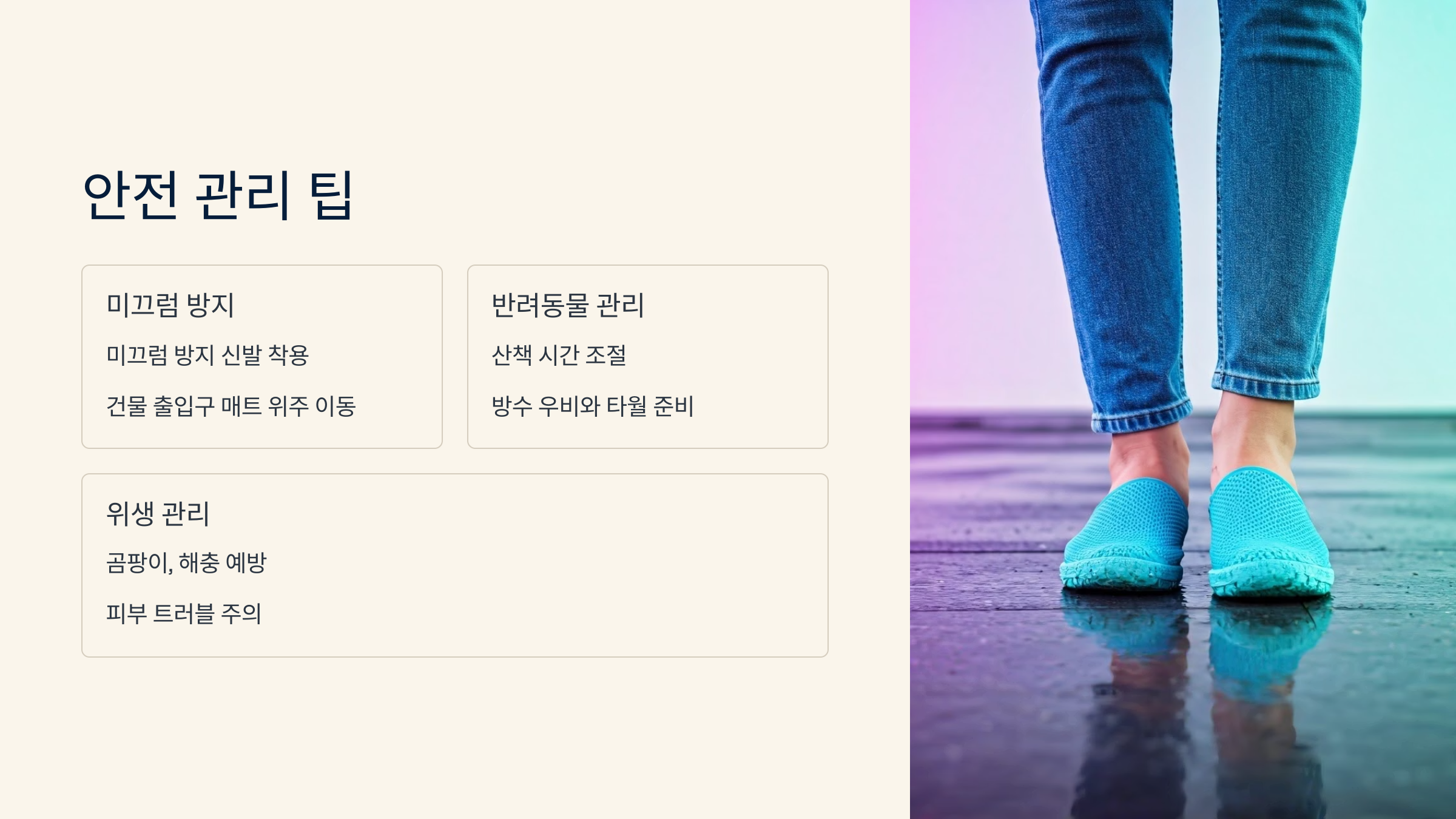 반려동물이 있는 가정은 산책 시간을 조절하거나, 방수 우비와 타월을 준비해서 건강관리를 신경 써주세요. 장마철은 곰팡이, 해충, 피부 트러블도 생기기 쉬운 시기이니 청결한 환경 유지도 매우 중요하답니다!
