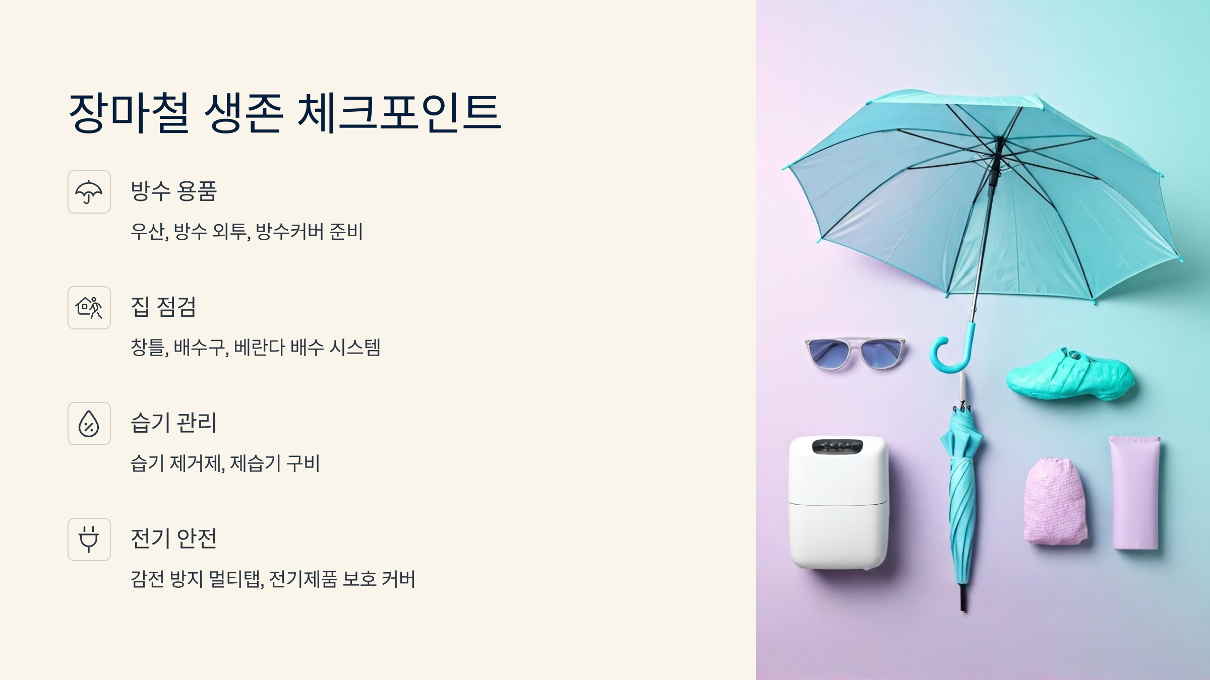 장마철, 그냥 우산 하나만 챙긴다고 대비 끝일까요? 그렇지 않아요! 생각보다 많은 변수가 숨어 있는 장마 시즌엔 조금만 더 꼼꼼히 준비하는 것이 중요하답니다. 여기 실생활에 바로 적용 가능한 꿀팁들을 모아봤어요.