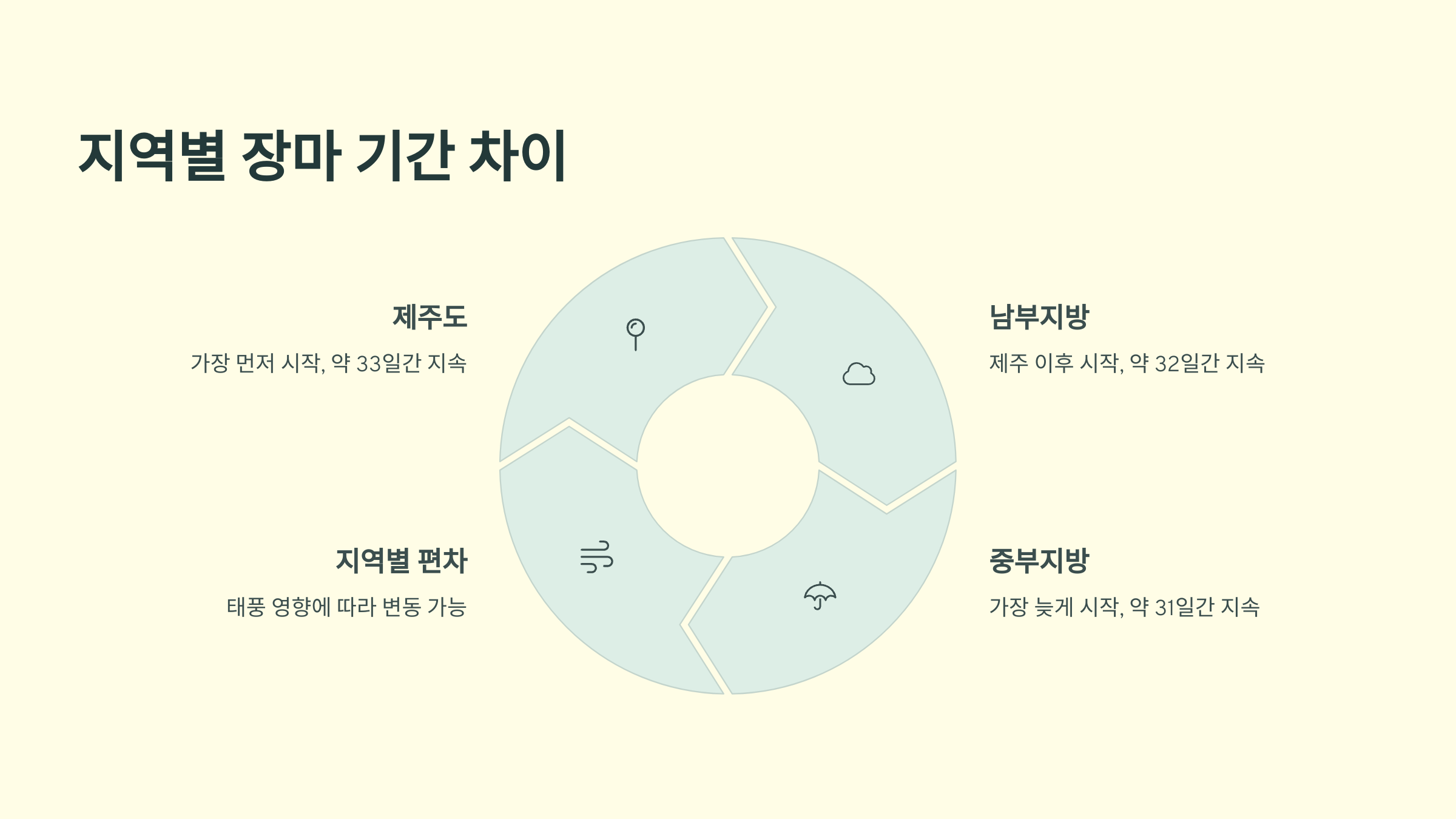💡 참고: 장마 시작일과 종료일은 실제 기상 상황에 따라 1~2주가량 차이가 날 수 있어요.