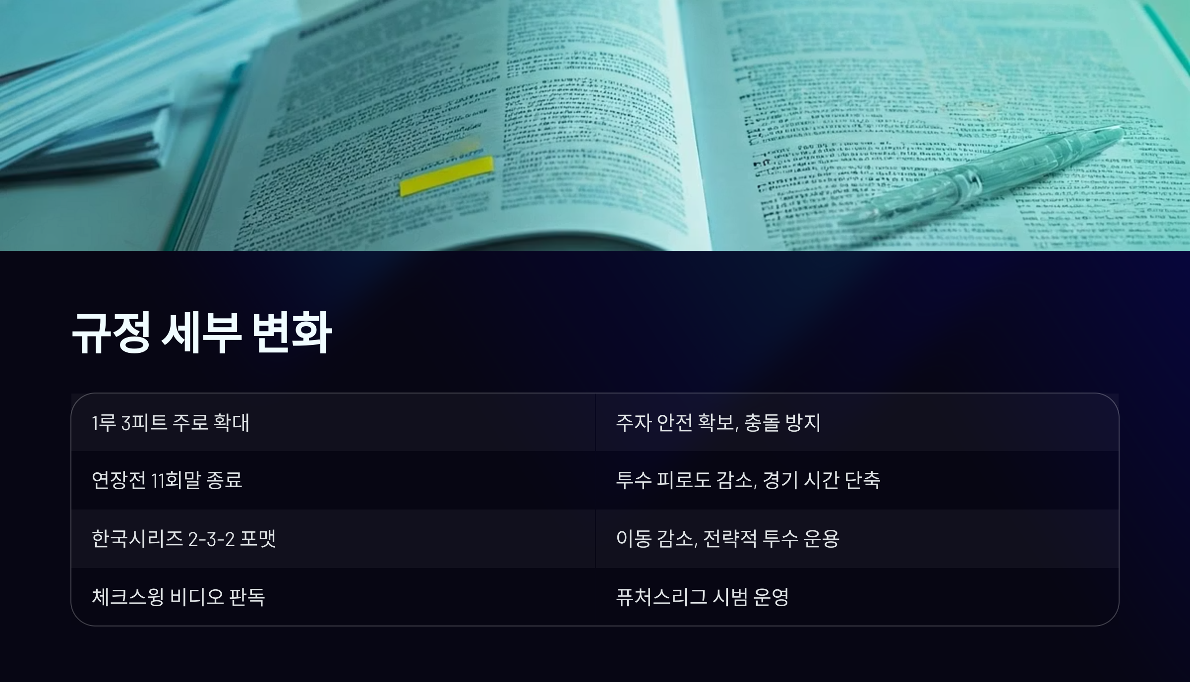 이는 MLB의 사례를 참고해 경기 시간 단축과 선수 체력 보호를 동시에 노린 조치예요.