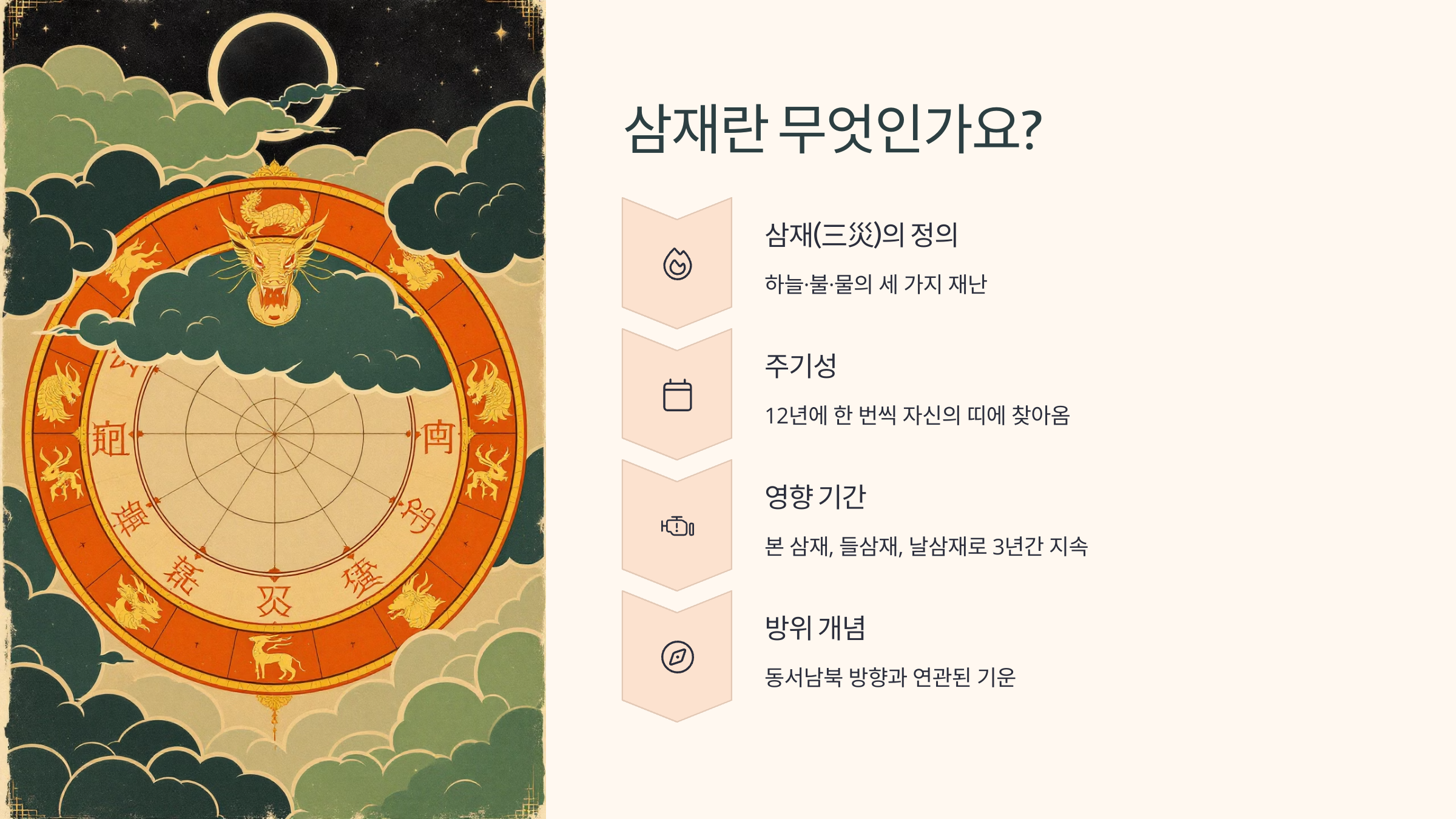 삼재(三災)는 동양 명리학에서 유래된 개념으로, 사람이 일생을 살아가며 반복적으로 겪는 세 가지 재난의 시기를 뜻합니다.