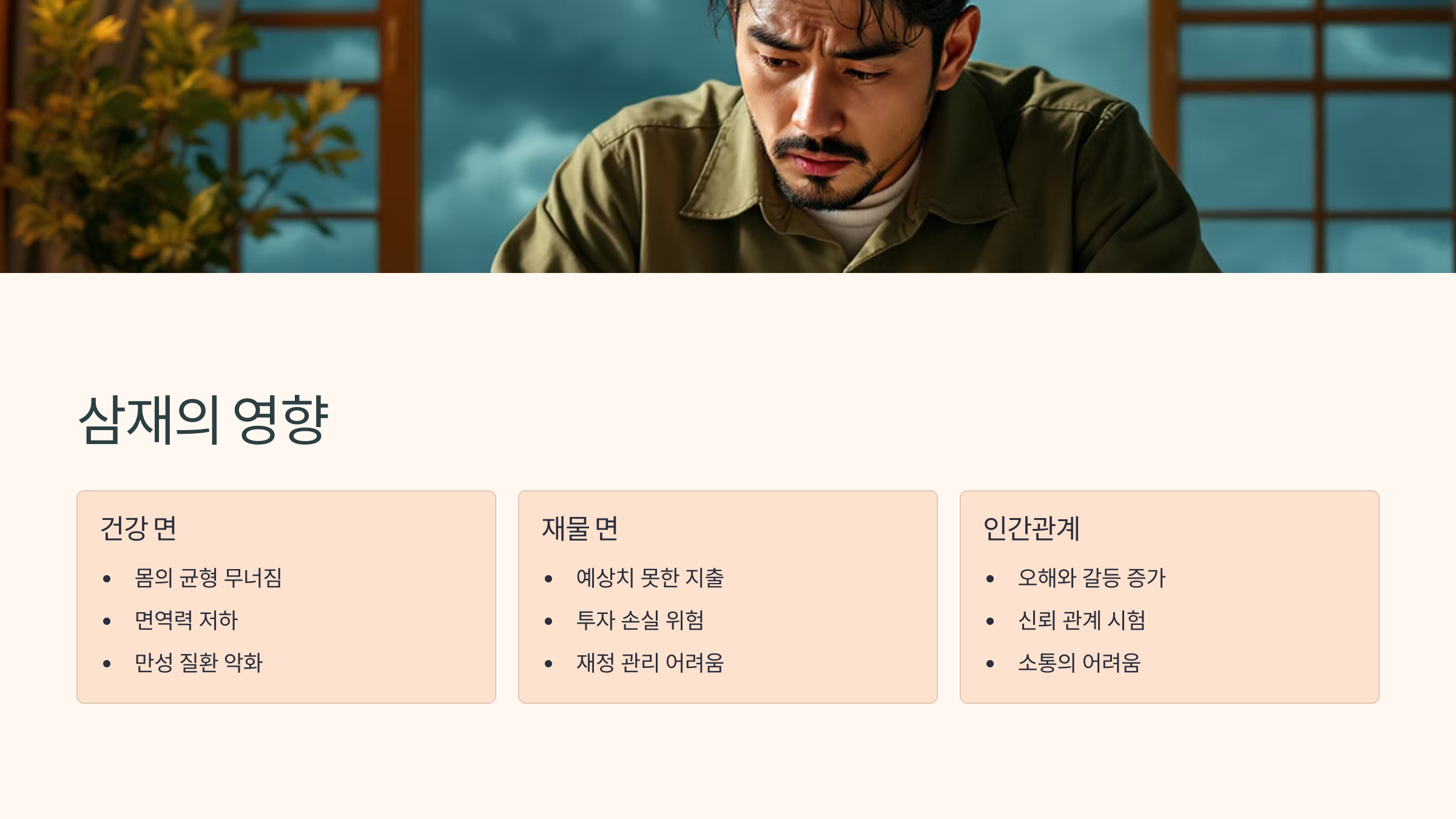 실제로 삼재 기간에는 다음과 같은 영향이 나타날 수 있습니다: