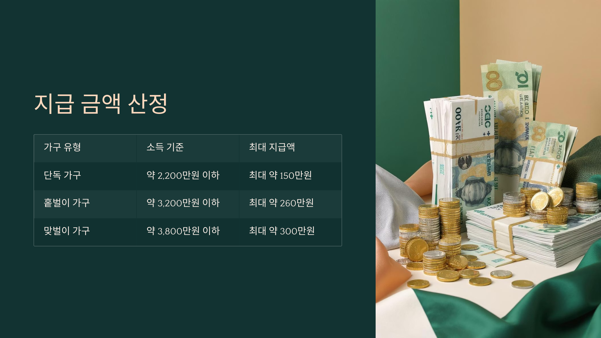 | 단독 가구 | 약 2,200만원 이하 | 최대 약 150만원 |