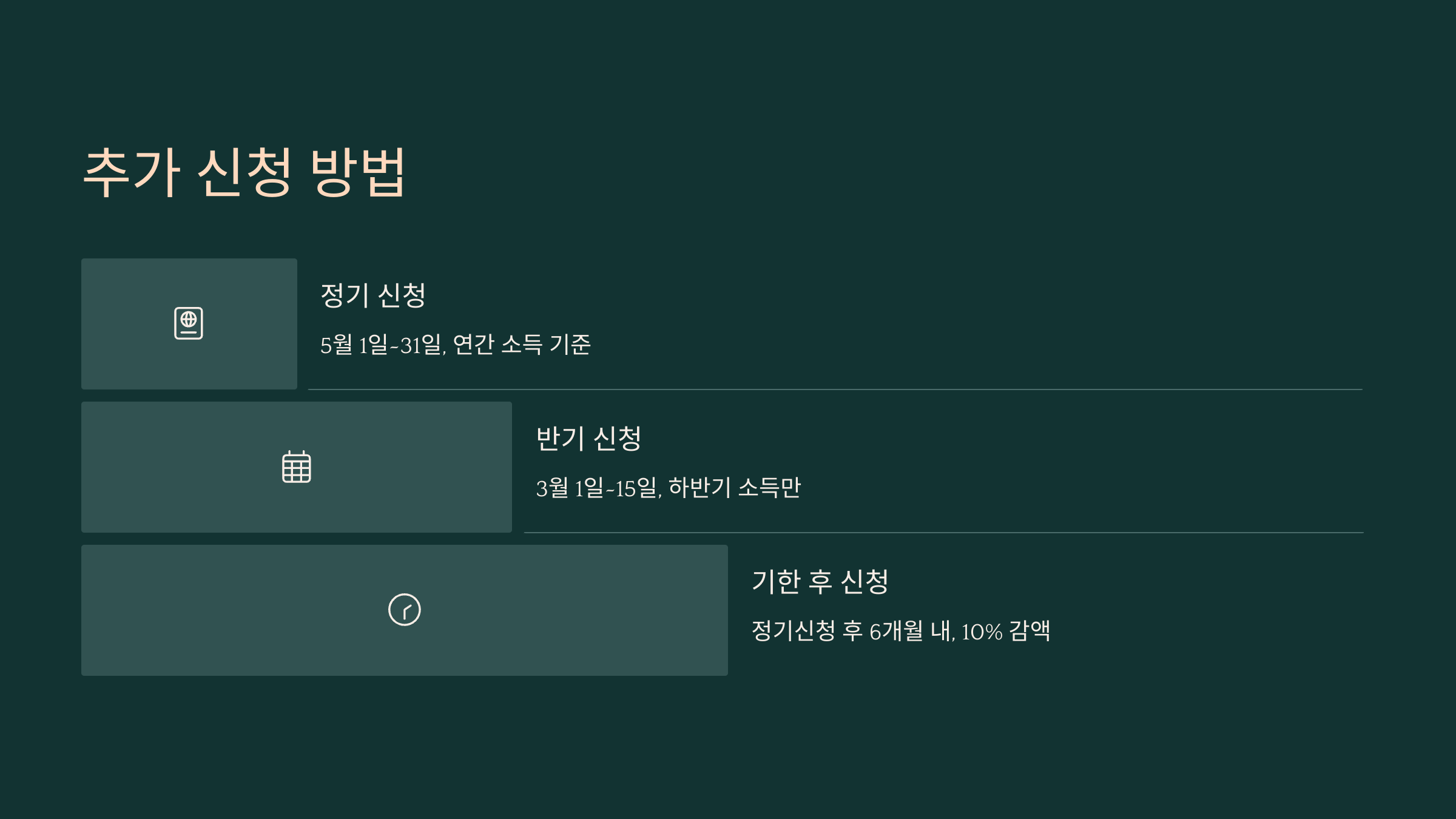 | 정기 신청 | 5월 1일 ~ 5월 31일 | 전체 소득 기준으로 연간 산정 |