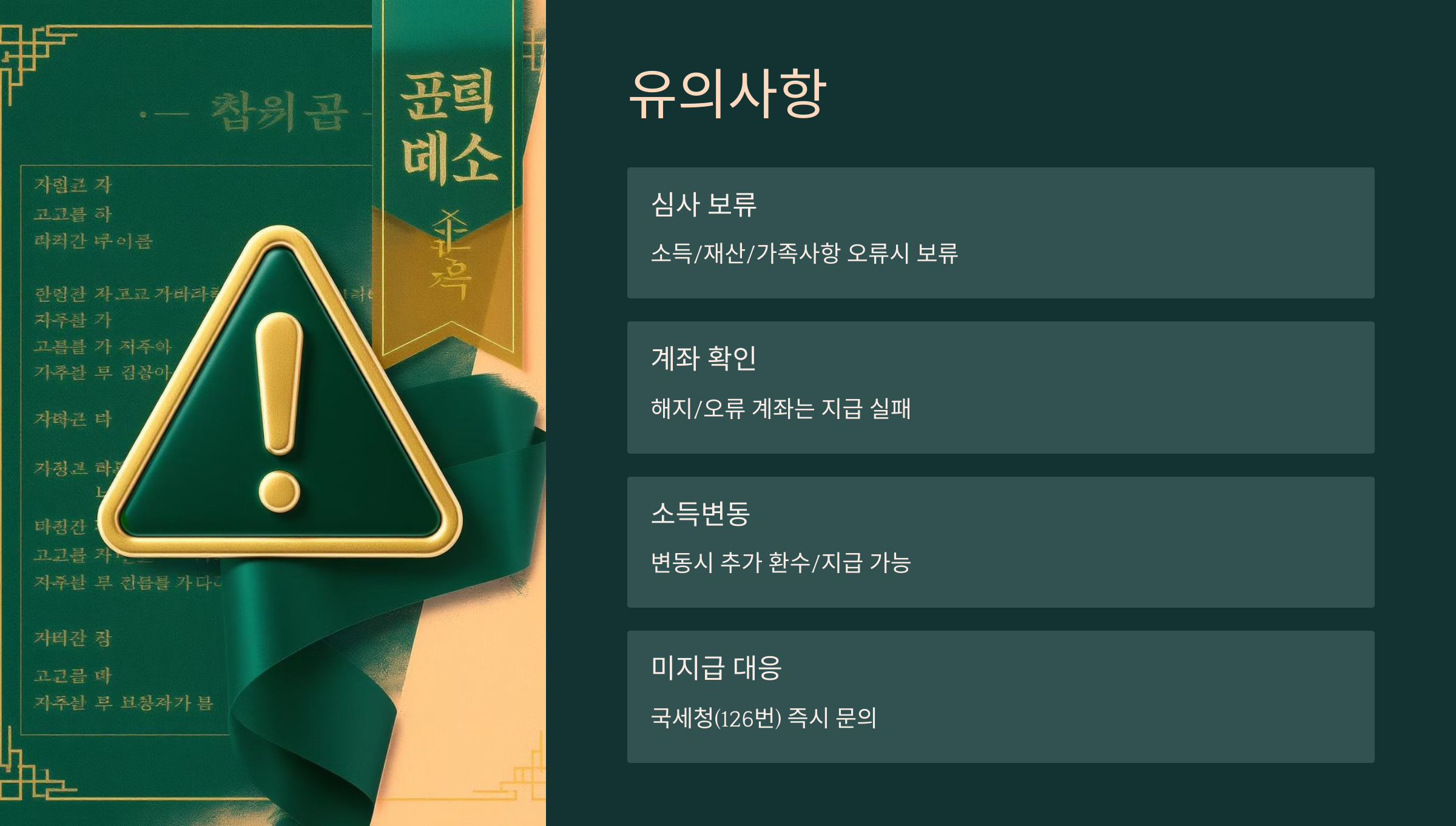 - 심사 보류 가능성: 신청서에 기재된 소득, 재산, 가족사항 등에서 오류나 미확인이 있을 경우 심사 보류될 수 있습니다.