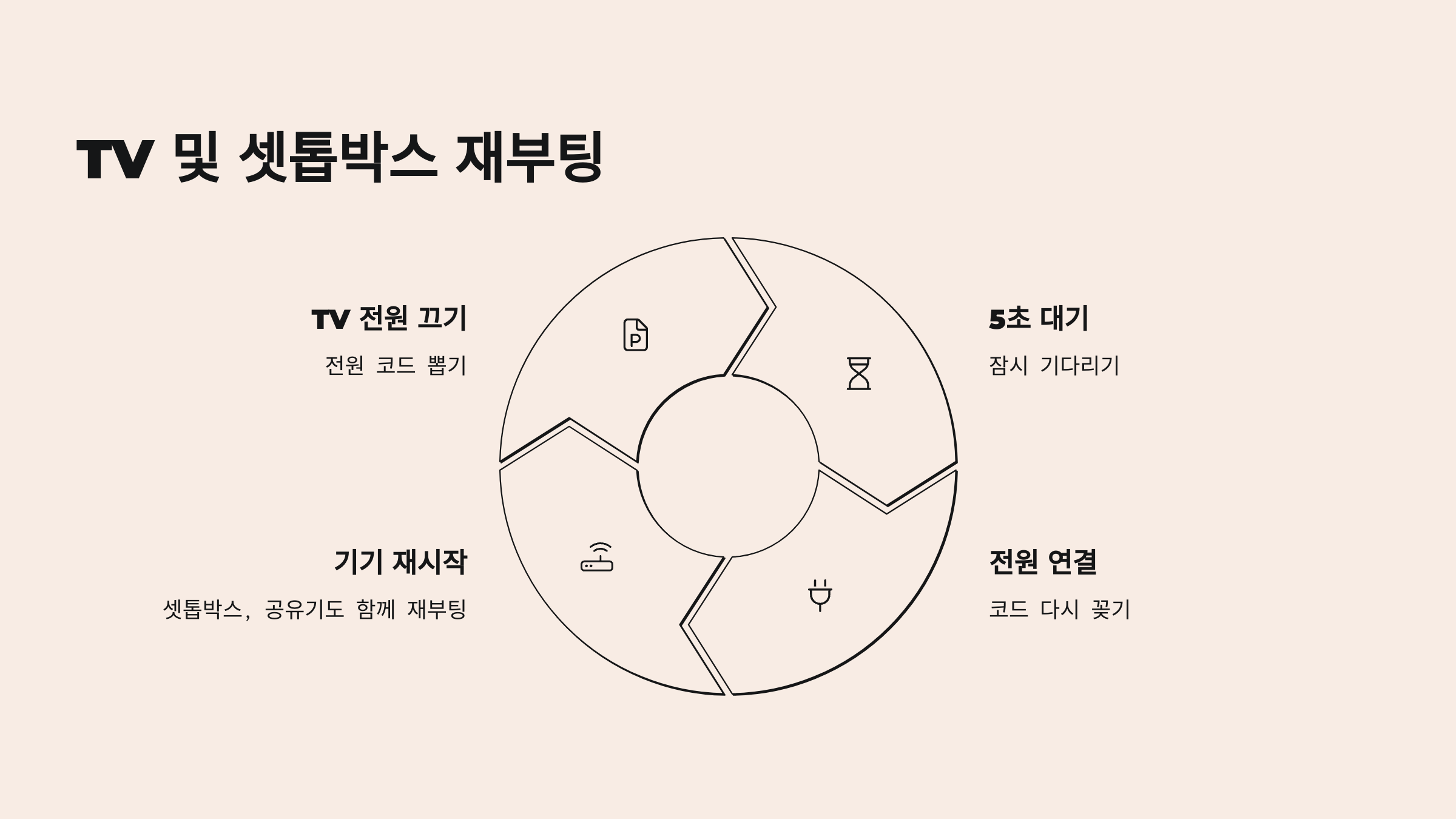 🔖 셋톱박스도 함께 재부팅: 셋톱박스를 사용 중이라면, 동일하게 전원을 껐다가 다시 켜주세요.