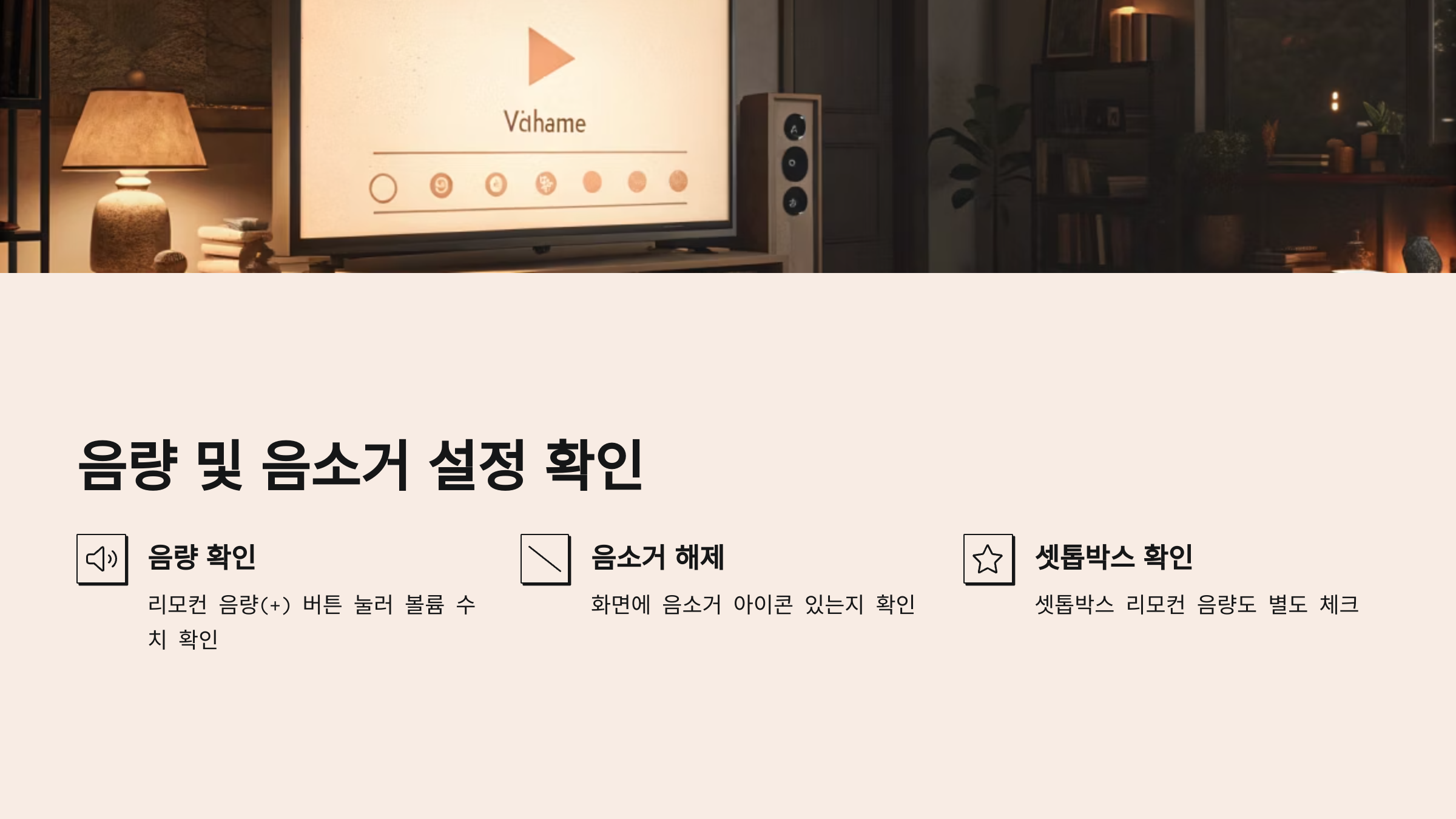 가장 흔한 원인은 음소거 설정이나 외부 기기 연결 문제입니다. 우선 TV와 셋톱박스의 음량과 음소거 설정을 확인하고, HDMI나 오디오 케이블 연결 상태도 점검해보세요.