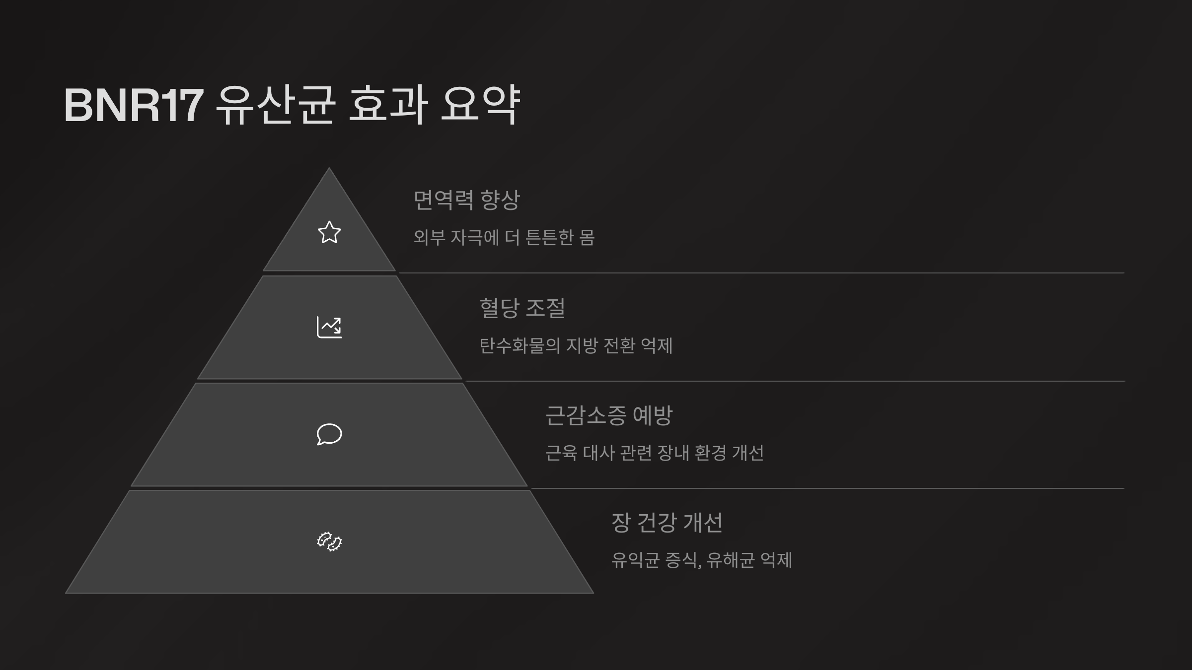 BNR17은 장 건강뿐만 아니라, 근육 대사에 영향을 주는 장내 환경 개선을 통해 근감소를 억제하는 데도 긍정적인 영향을 줄 수 있어요.