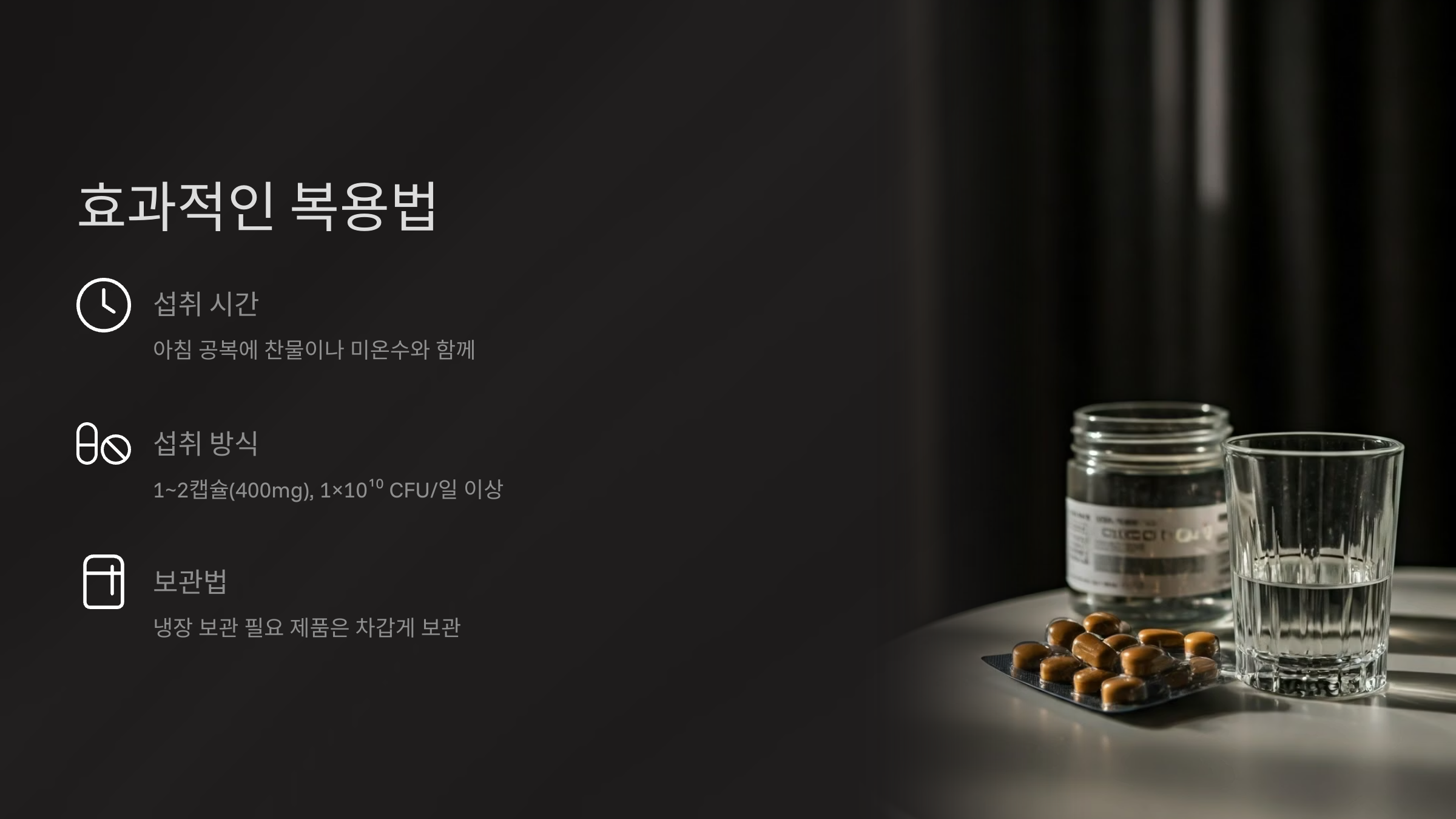 🔖 섭취 방식: 1~2캡슐(또는 400mg), 식약처 기준 1 × 10¹⁰ CFU/일 이상 권장