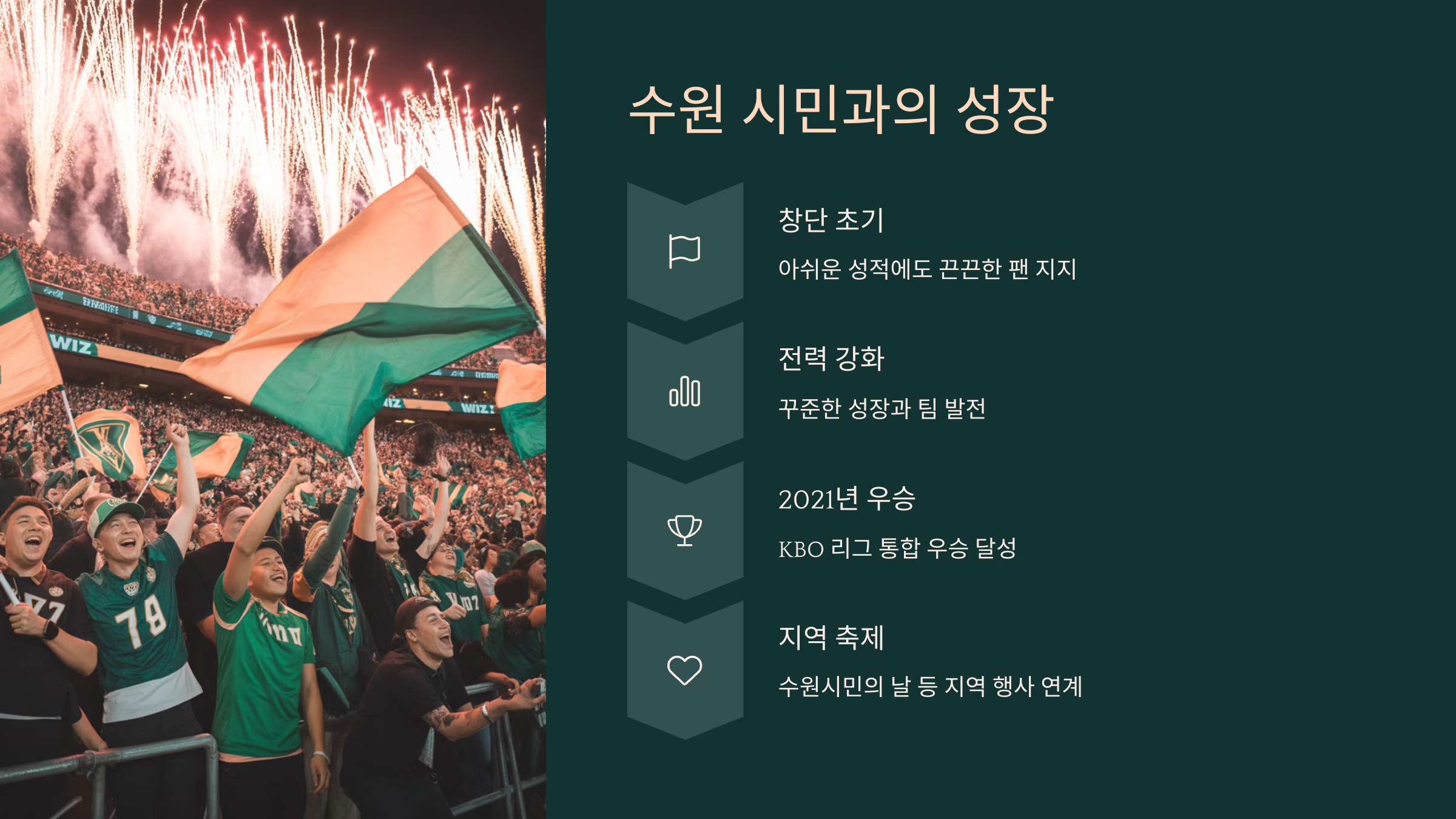 kt 위즈는 수원 시민과의 끈끈한 유대를 바탕으로 꾸준히 성장해 왔어요.