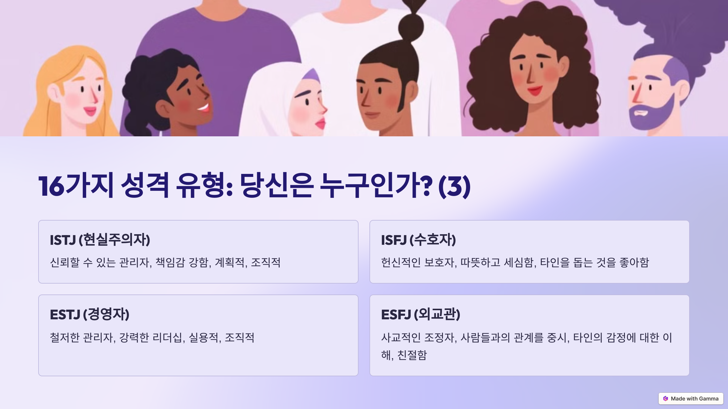10) ISFJ (수호자) – 헌신적인 보호자 특징: 따뜻하고 세심하며 타인을 돕는 것을 좋아함