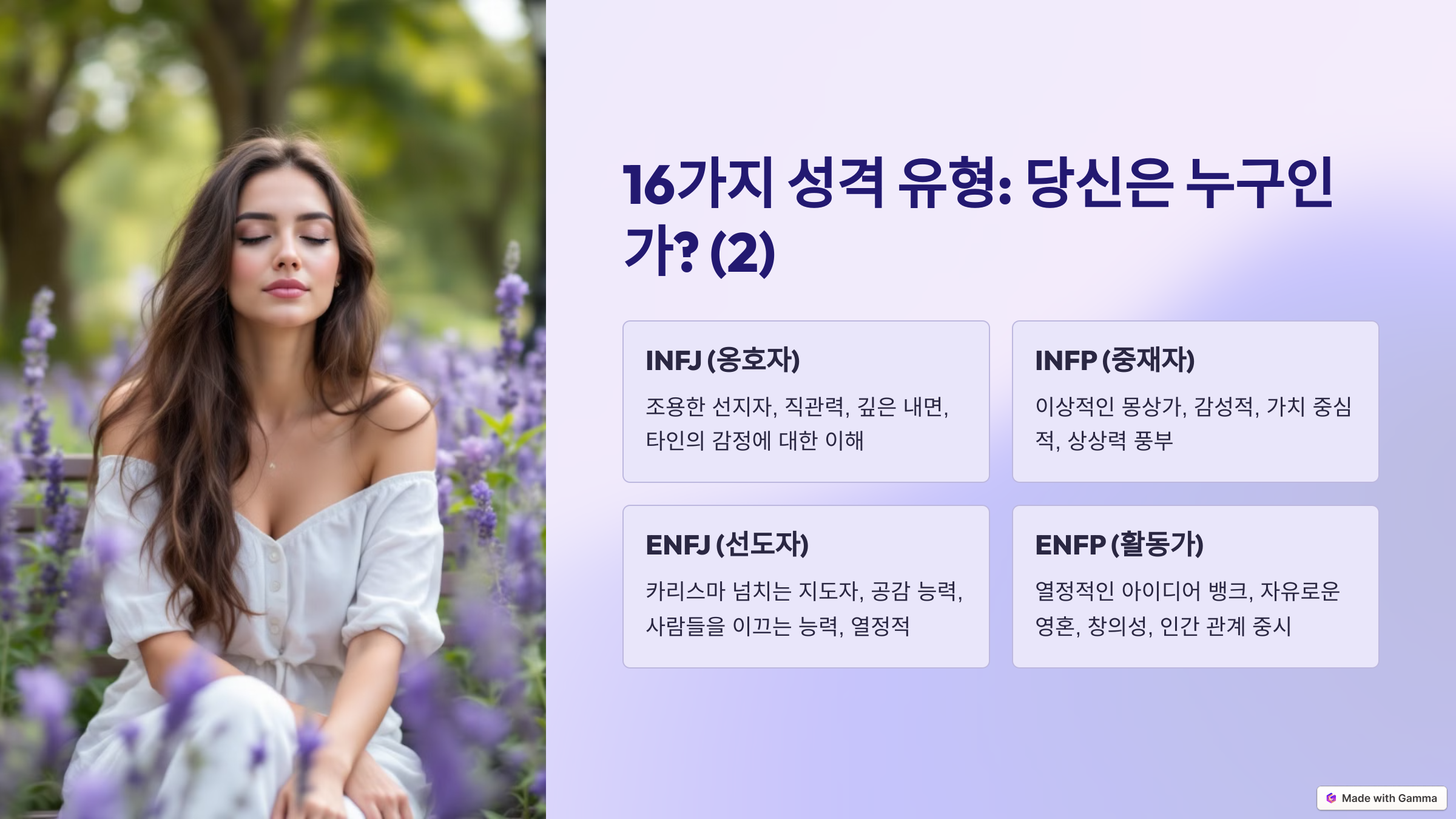 5) INFJ (옹호자) – 조용한 선지자 특징: 직관적이고 통찰력이 뛰어나며 깊은 내면을 가짐